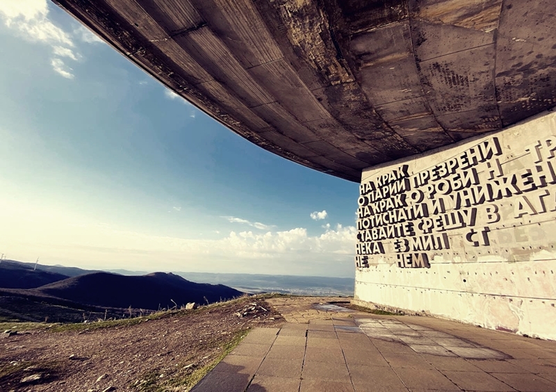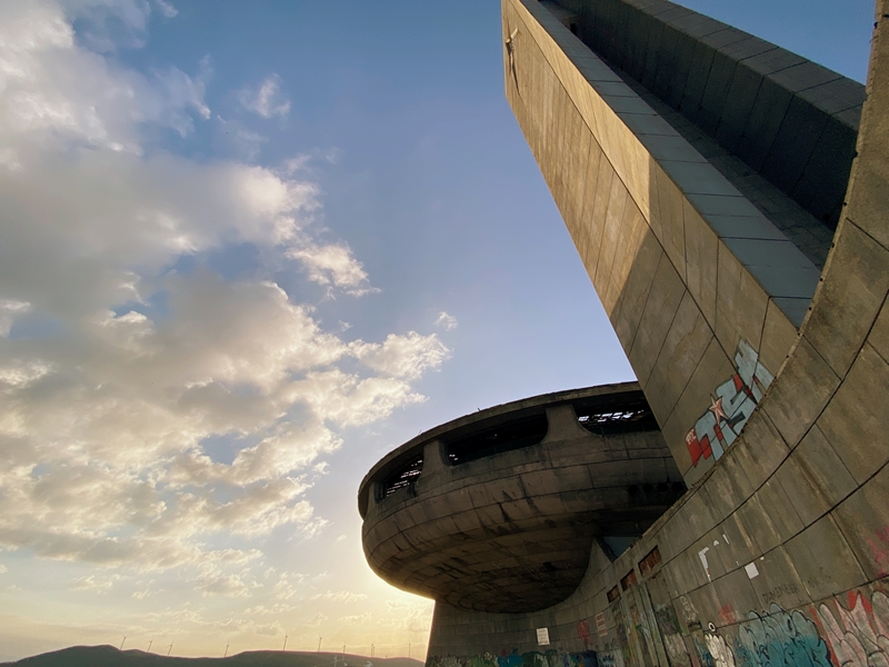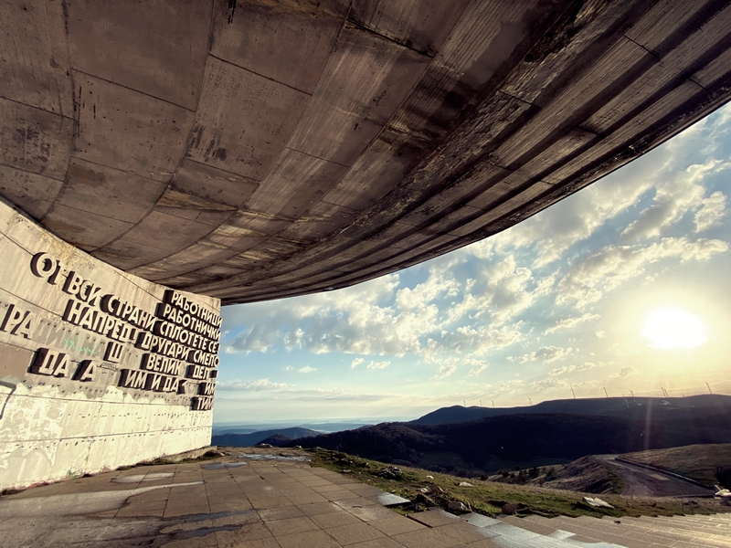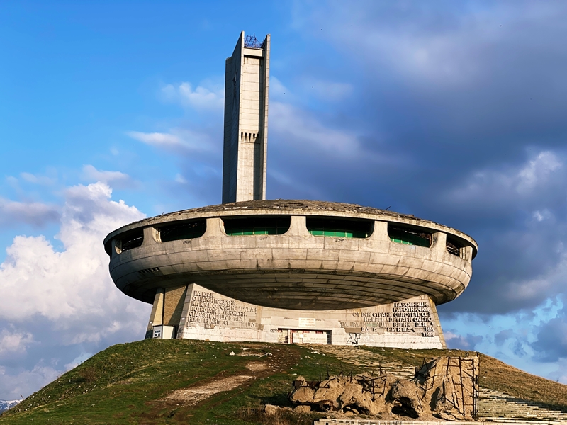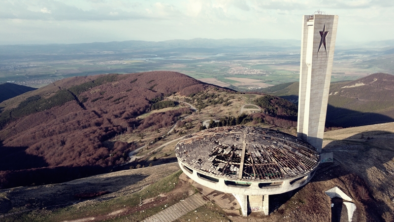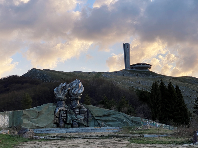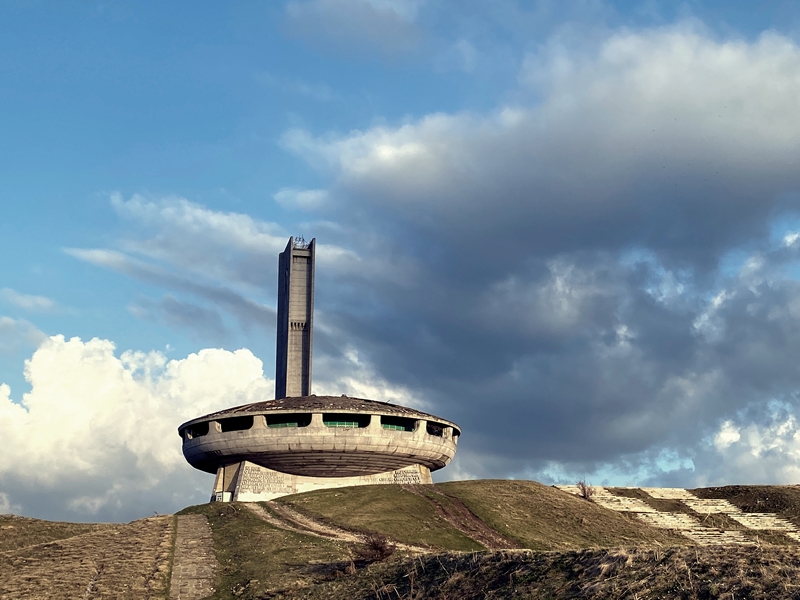 Winding up the forested roads of the Central Balkan Mountains, the monument slowly emerges on the horizon like something out of a sci-fi film. There’s no mistaking it. Its saucer-like top and towering red star-adorned spire pierce through the fog, dominating the ridgeline.