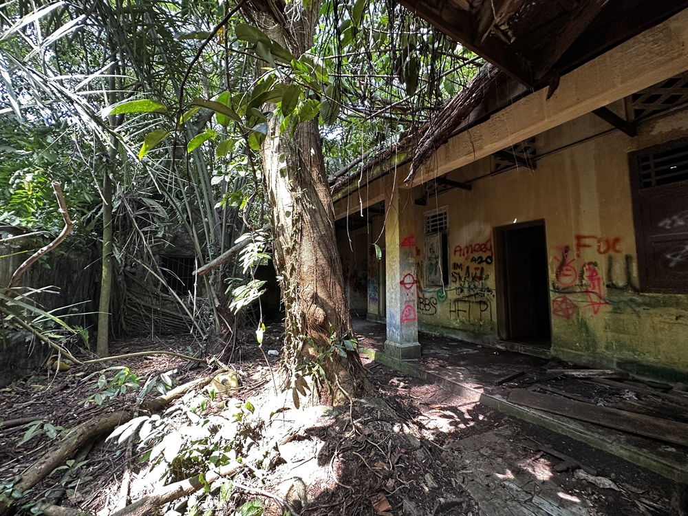 Suddenly, it appears—Istana Woodneuk, its blue-tiled roof mostly collapsed, walls blackened by fire and time. Built in the late 19th century by Sultan Abu Bakar of Johor for his fourth wife, the mansion was once the height of luxury. It later served as a British military hospital during World War II and was bombed during the Japanese invasion. Today, nature has reclaimed it. Trees grow through its foundations, roots snake across tiled floors, and graffiti marks the passing of explorers and vandals alike.